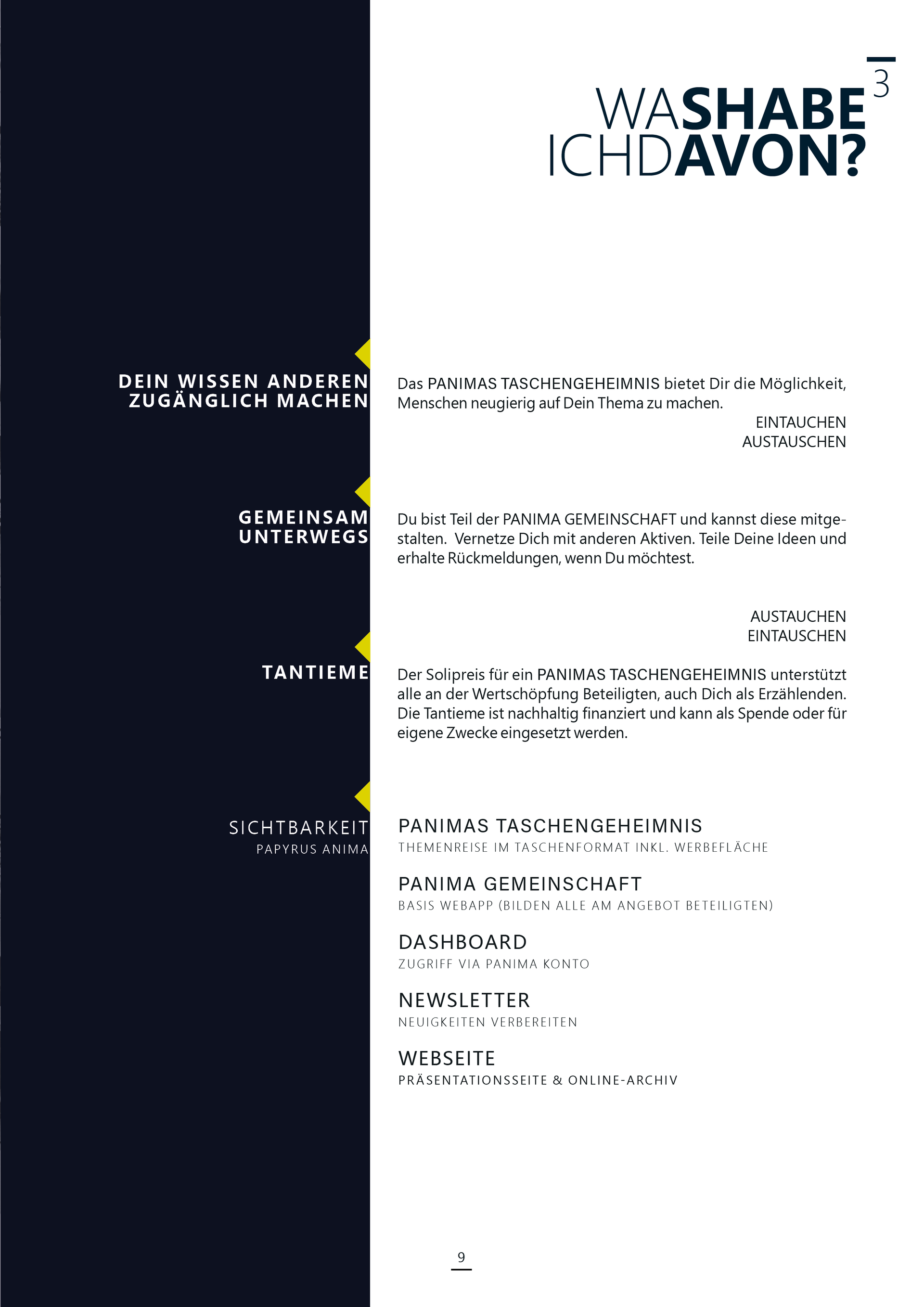 Mit dem Verkauf eines PANIMAS TASCHENGEHEIMNISSES erzielen wir Umsatz, der allen Beteiligten zu Gute kommen; Dir als Erzählenden in Form einer Tantieme.